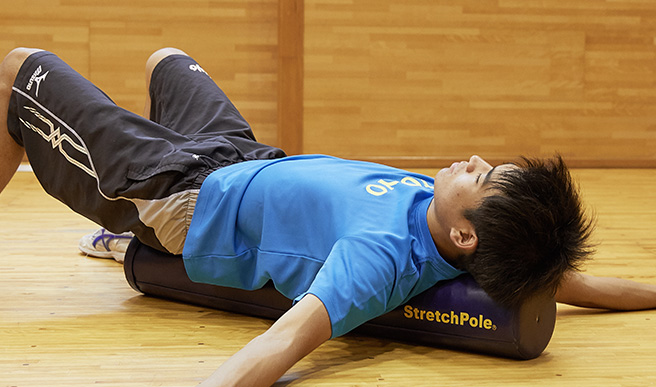 - ストレッチポールを縦に置き、仰向けで背骨の下に沿うように乗る